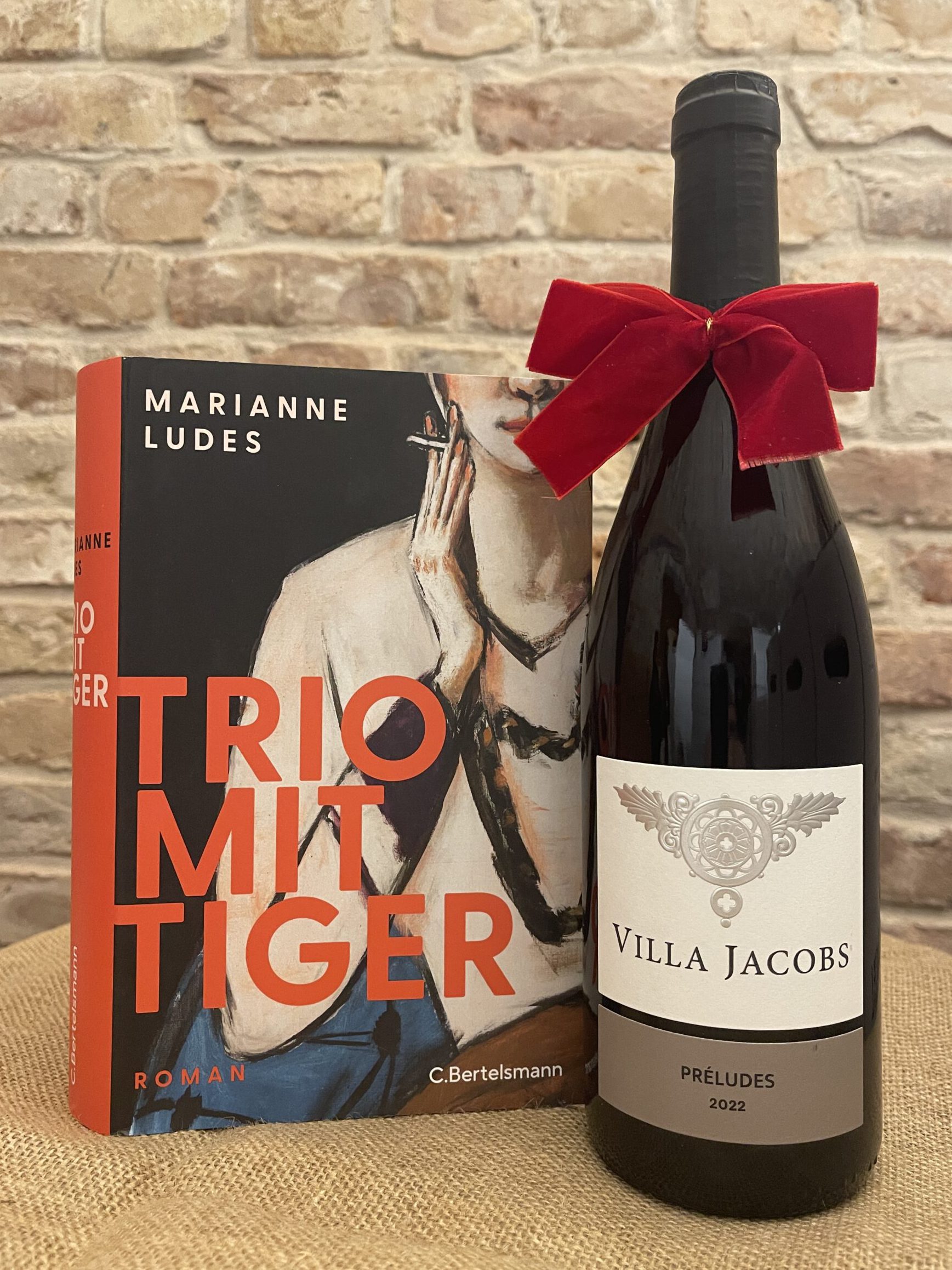 Der Roman „TRIO MIT TIGER“ (erschienen im August 2025) von Marianne Ludes im Paket mit einer Flasche unseres Préludes zum Preis von 50 €.